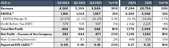 • 2025 EBITDA increased 12% YoY to AED 5.1 billion, translating into an EBITDA margin of 24.4%